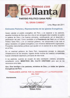 Quiero saludar al pueblo evangélico del Perú, y en especial a los pastores, aquellos hombres de Dios que día a día en tan abnegada labor enseñan al pueblo la palabra de Dios y los buenos principios, contribuyendo así al desarrollo y pacificación del país. Como candidato a la Presidencia del Perú por el Partido Político Gana Perú, y en un eventual gobierno, me comprometo a dar todo el apoyo necesario a la iglesia evangélica y sus ministros debidamente organizados. Proveerles instrumentos jurídicos que ayuden en el avance de la obra misionera en el Perú.