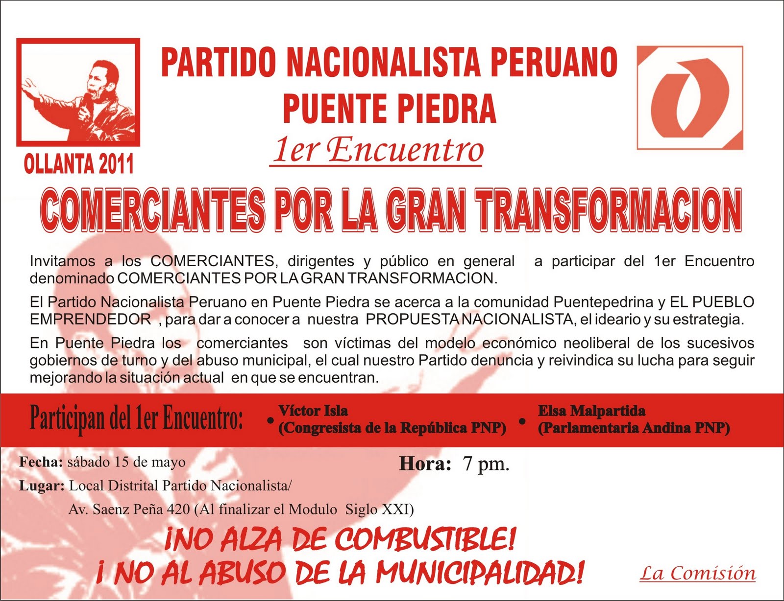 Lugar: Local Distrital Partido Nacionalista / Av. Sáenz Peña 420 (Al finalizar el modulo siglo XXI)