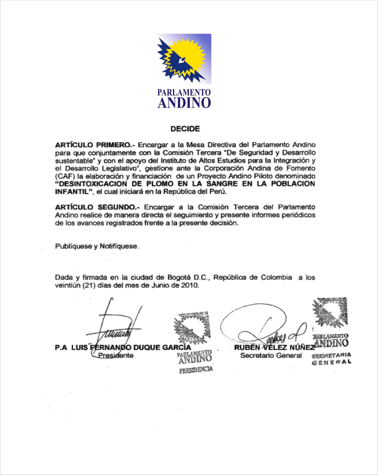 ARTICULO PRIMERO.- Encargar a la mesa Directiva del Parlamento Andino para que conjuntamente con la Comisión Tercera "De Seguridad y Desarrollo Sustentable" y con el apoyo del Instituto de Altos Estudios para la integración y el desarrollo legislativo", gestione ante la Cor`poración Andina de Fomento CAF la elaboración y financiación de un proyecto Andino Piloto denominado "DESINTOXICACION DE PLOMO EN LA SANGRE EN LA POBLACION INFANTIL" el cual iniciara en la Republica del Perú.