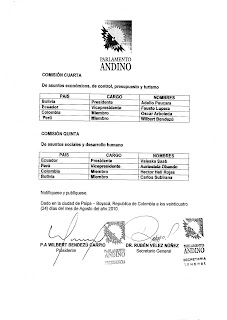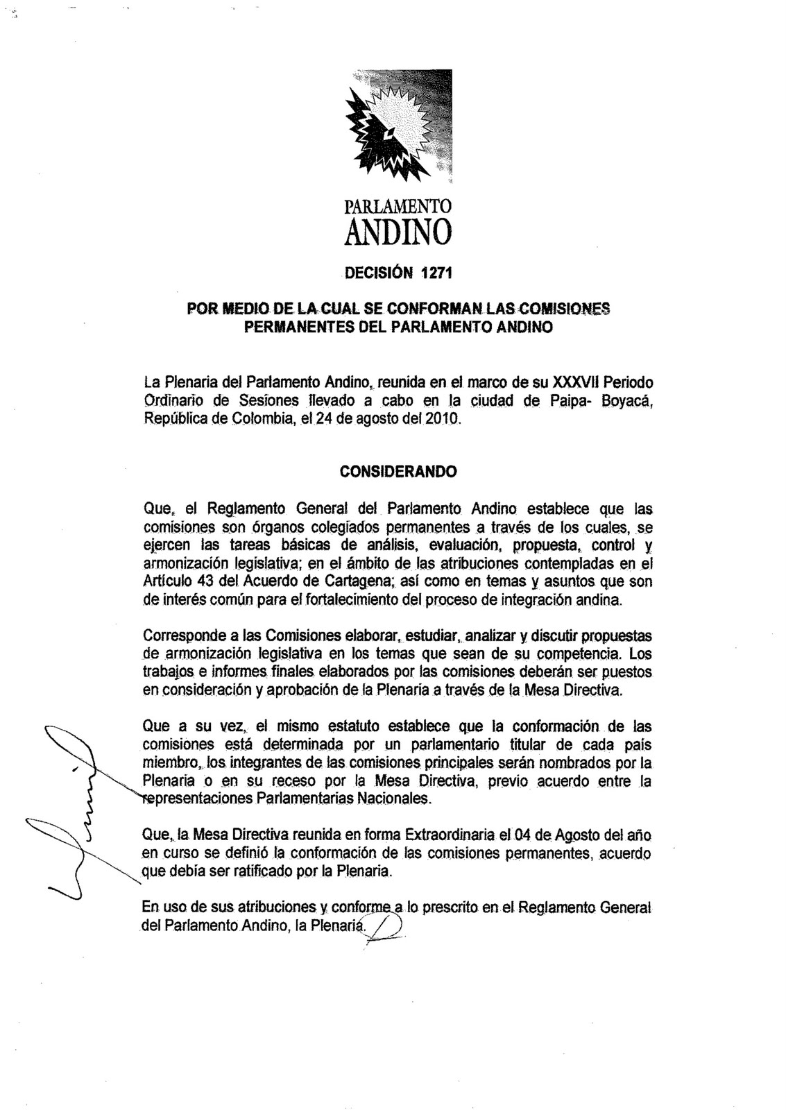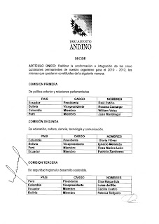 Decisión 1271 por medio de la cual se ratificaron en Plenaria la conformación de las Comisiones Ordinarias del Parlamento Andino.