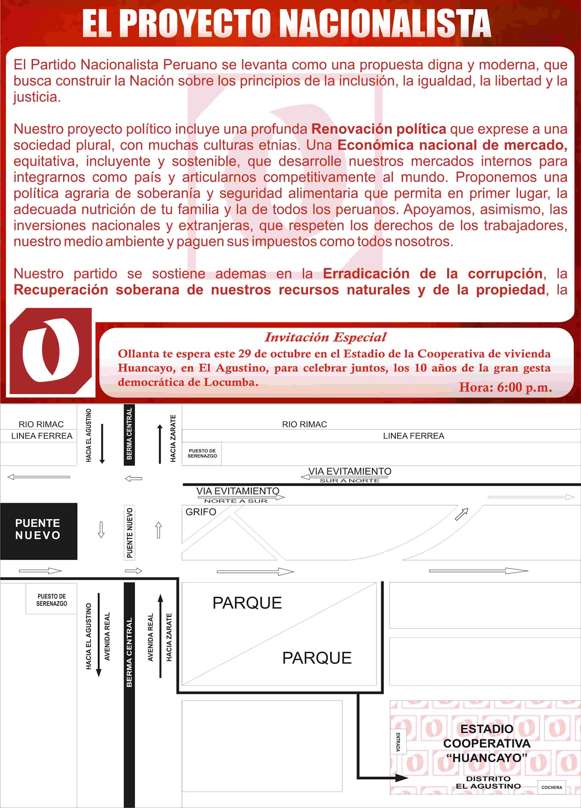 Nuestro partido se sostiene ademas en la Erradicación de la corrupción, la Recuperación soberana de nuestros recursos naturales y de la propiedad, la defensa de la soberanía nacional y una Descentralización que haga coincidir al gobierno local y regional con el desarrollo territorial. Para ello, promoveremos regiones que incluyan Costa, Sierra, Selva y nuestro mar.