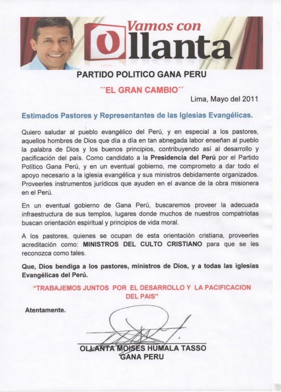 Quiero saludar al pueblo evangélico del Perú, y en especial a los pastores, aquellos hombres de Dios que día a día en tan abnegada labor enseñan al pueblo la palabra de Dios y los buenos principios, contribuyendo así al desarrollo y pacificación del país. Como candidato a la Presidencia del Perú por el Partido Político Gana Perú, y en un eventual gobierno, me comprometo a dar todo el apoyo necesario a la iglesia evangélica y sus ministros debidamente organizados. Proveerles instrumentos jurídicos que ayuden en el avance de la obra misionera en el Perú.